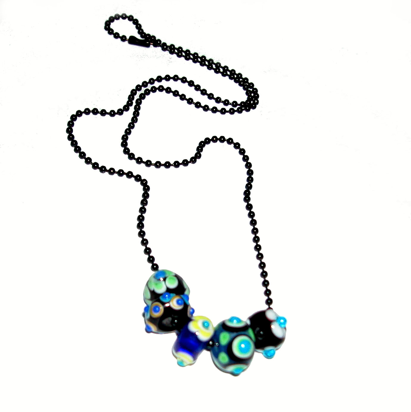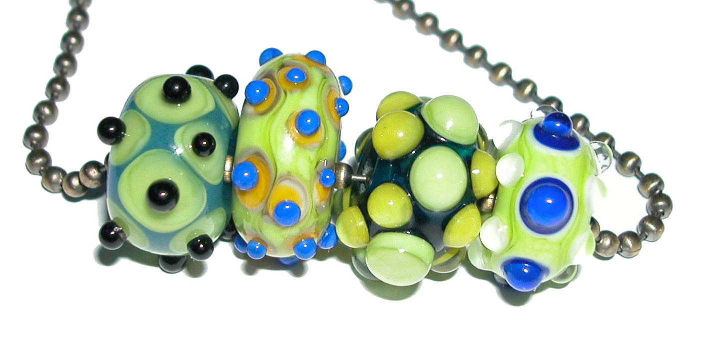 The wonderful surprise for me was meeting April who lives nearby my home in PA. Transported from Brooklyn some years ago she has been making exquisite beads ever since her days at Art School in NY. I have an ever growing pouch of carefully chosen beads form her latest creations. First of all I have to say I love color and dots. Many of her beads are variations of a dot theme and I have never found beads more specially dotted than hers! The joy I get from combining and recombining their colors and shapes into necklace combinations has made this little exercise a captivation for me that sometimes mesmerizes me for hours. |