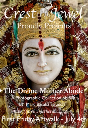 The Divine Mother AbodeAt First Friday's Art Walk this Friday, July 4th, Crest Jewel will have the Grand Opening Celebration of "The Divine Mother Abode", a collection of photographs by Marc Baraka Strauch each carefully printed on the finest silk. This is the first time his large billowy silk portraits of the Divine Mother can be seen altogether in one place.
